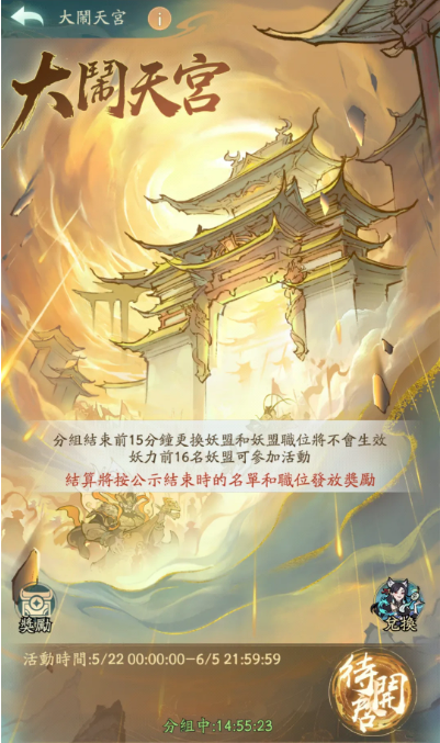 大闹天宫活动的参战单位为妖盟,活动时间为每日10:00至22:00。参与的玩家会被随机分配到四个妖族阵营:焚天、镇岳、裂海和绝风,每个阵营下又有四个妖盟。需要注意的是,在活动中,角色的基础属性会受到压制,战斗属性、抗性和特殊属性会等比缩减。要想恢复基础属性,玩家需要击败天兵天降,这种机制让人联想到蛮荒和未央仙境等玩法。