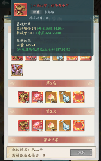 活动的排行奖励分为个人伤害、阵营伤害和阵营竞速奖励。其中,个人伤害奖励最为吸引人,玩家可以获得【魔尊·杨戬的皮肤】以及【神话法宝·锁子黄金甲】。