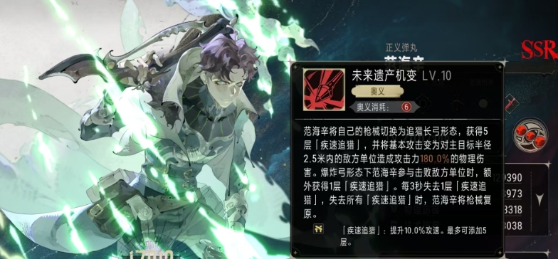 范海辛作为教会阵营的核心角色,其特性和技能都颇具魅力。他的定位为轻型角色,月相为满月,赋予了他一种神秘而强大的能力。面对单一目标或小范围敌人时,他能造成持续且可观的伤害。范海辛的奥义技能“未来遗产机变”让他在战斗中如同变身的超级英雄,瞬间将武器切换为追猎长弓,提升了5层极速追猎效果,让他的攻击力如同开了挂一般。