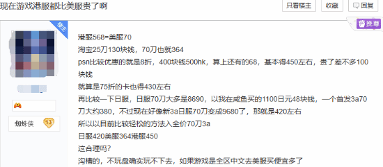 美国区70美元的游戏相当于香港区的568港币。小编验证了几家点卡店铺后发现,以购买点卡的方式,1港币≈0.8875元。这样计算下来,568港币≈504元。而美国区的点卡相对便宜,409.5元就能购买到价值70美元的点卡。可以看出,购买一款原价70美元的游戏,香港区比美国区贵了约100元。据网友称,日本区的点卡虽然比美国区稍贵,但仍比香港区便宜。