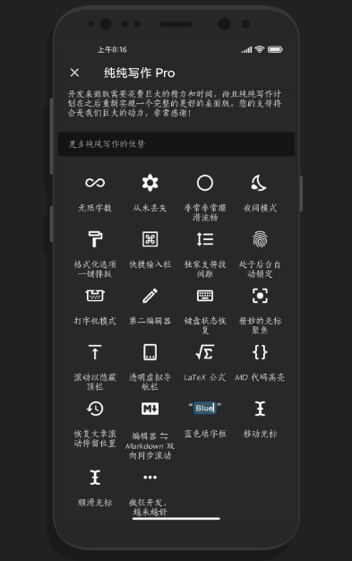 这款写作助手是许多小伙伴使用的功能性强大的写作工具,可以自由选择颜色、字体大小和文章背景,编辑功能非常丰富,支持自定义快捷短语输入,也可以快速分享到其他应用程序。该应用还具有全面的自动备份功能,可将各种数据上传到应用中,避免数据丢失。